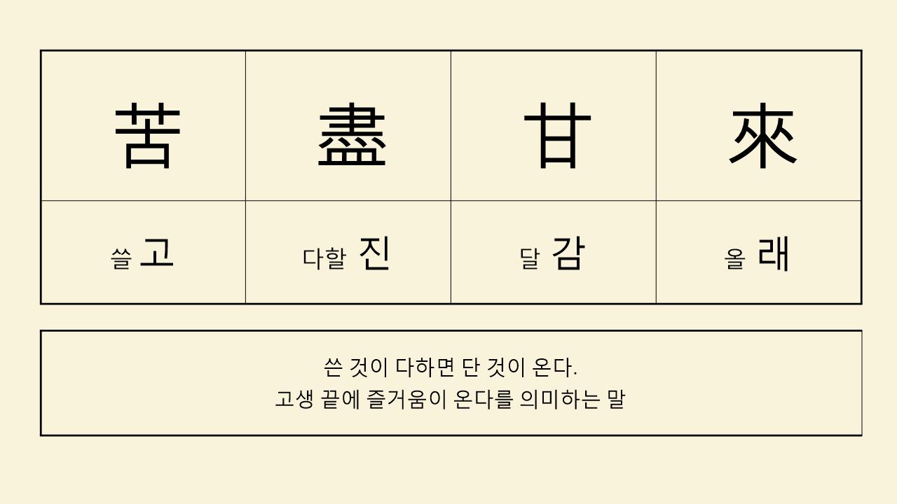 쓴 것이 다하면 단 것이 온다는 뜻으로, 고생 끝에 즐거움이 오는 것을 이르는 말합니다. 예를 들어 '고진감래라더니 이렇게 좋은 일도 있구나', '나는 힘든 일이 닥칠 때마다 고진감래라는 말을 생각하며 어려움을 참아 냈다.' 등으로 사용합니다. 비슷한 속담으로는 '고생 끝에 낙이 온다'가 있습니다.