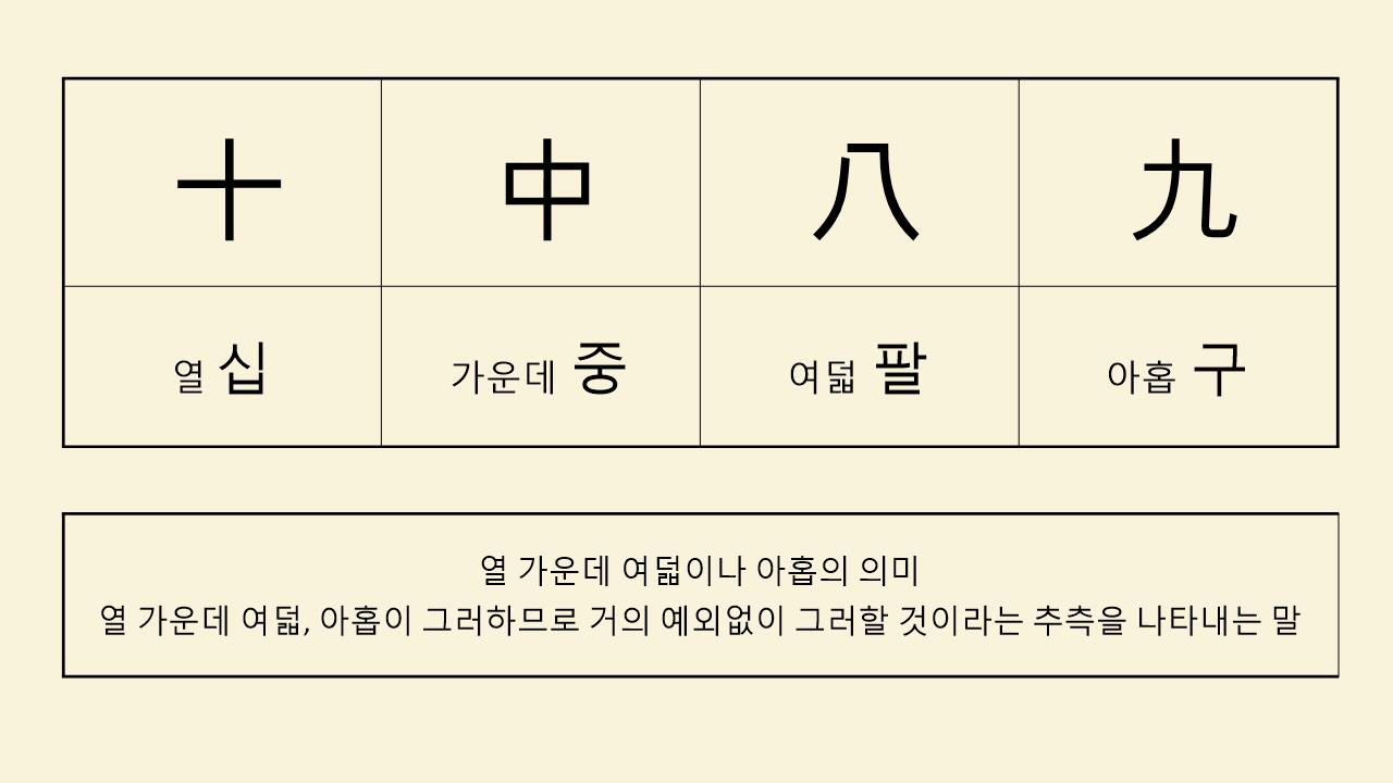 열 중에 과반수를 훨씬 웃도는 수치를 뜻하여 거의 다, 대부분이라는 의미이다. 어떤 정황에 대한 짐작이 아주 들어맞을 때, 어떤 결과로 귀결될 것이라는 확신이 매우 클 때, 경우의 수나 축적된 통계를 바탕으로 어떤 일의 인과관계를 높은 확률로 확신할 수 있을 때 쓰이는 말이다. [十中八九] (두산백과 두피디아, 두산백과)