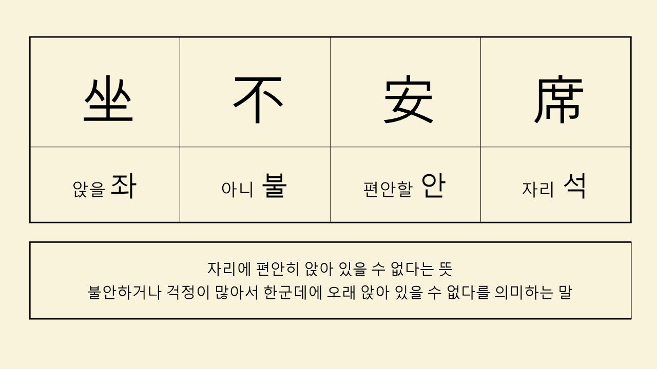 비슷한 뜻으로 좌립불안(坐立不安), 침불안석(寢不安席), 침식불안(寢食不安), 여좌침석(如坐針席), 침불안식불감(寢不安食不甘) 등이 있다. 좌불안석 [坐不安席] (두산백과 두피디아, 두산백과)'교육 정보' 카테고리의 다른 글