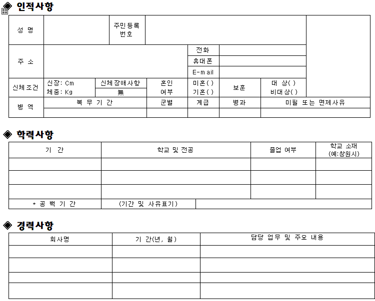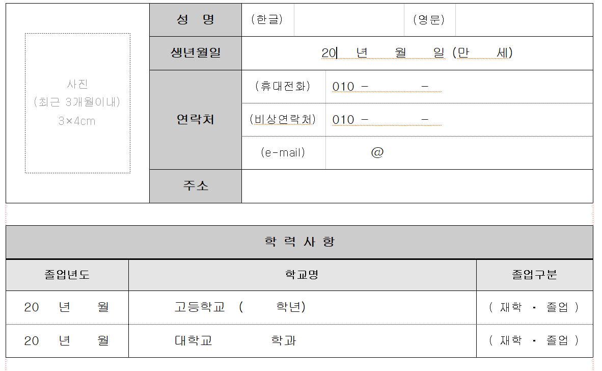 한국에서 가장 많이 쓰는 한글프로그램으로 만들어진 이력서 양식입니다.