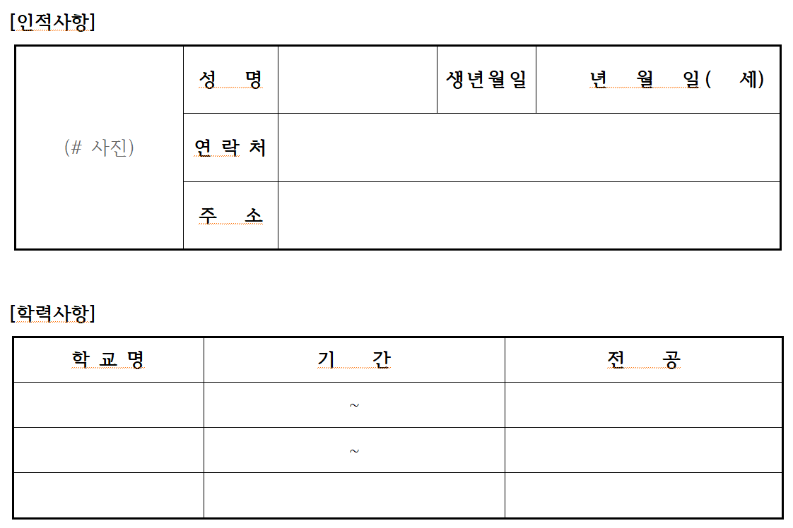 한국에서 가장 많이 쓰는 한글프로그램으로 만들어진 이력서 양식입니다.