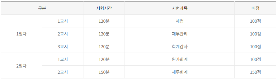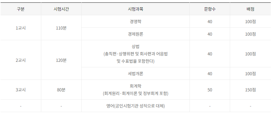 공통 응시 자격"학교 등에서 학점이수 해당과목별로 회계학 및 세무관련과목 12학점 이상, 경영학과목 9학점 이상, 경제학과목 3학점 이상을 이수한 자 또는 이수한 것으로 학점인정을 받은 자" 제 1차 시험
