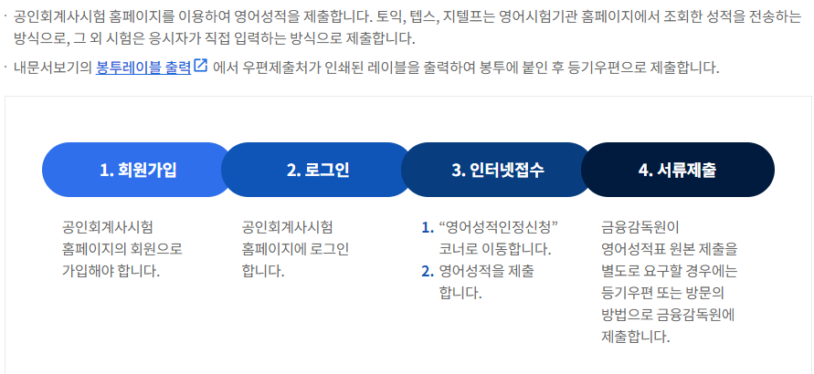 시험일자, 점수 등공인영어시험의 종류, 시험일자, 점수 등을 제출. 토익, 텝스, 지텔프는 영어시험기관 홈페이지에서 조회한 성적을 공인회계사시험 홈페이지로 전송하는 방식으로, 그 외 시험은 공인회계사시험 홈페이지 영어성적인정신청란에서 입력하는 방식으로 제출. 금융감독원은 필요한 경우 영어성적표 원본의 제출을 요구 가능 ◆공인회계사/CPA 응시 자격◆