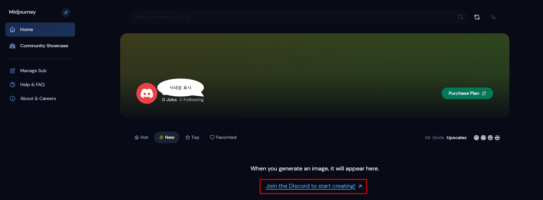 미드저니로 입장하게되면 보이는 첫 화면 입니다.