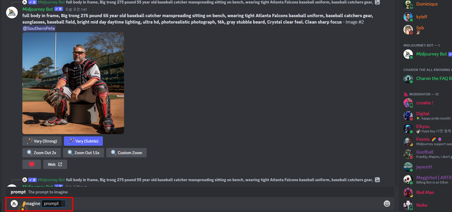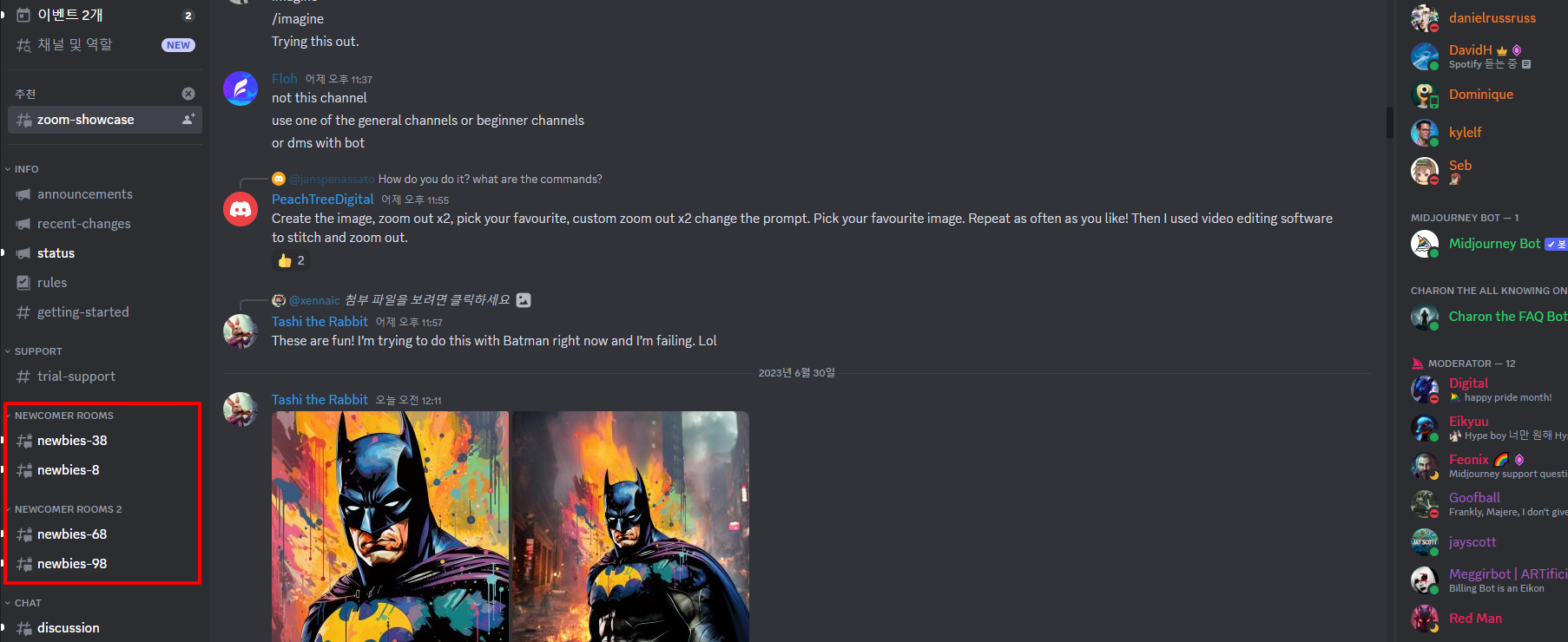 무료 상태로 이용할 수 있으며, 다른 유저들이 생성하는 이미지를 볼 수 있는 공개방 2. 미드저니로 그림 그리기