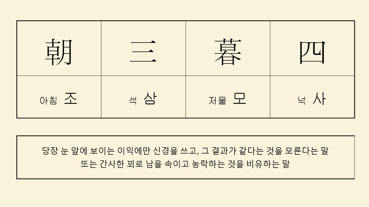 ‘아침에 세 개, 저녁에 네 개’라는 뜻. 송나라의 저공이 원숭이에게 먹이를 아침에 세 개, 저녁에 네 개씩 주겠다고 했더니 원숭이들이 적다고 화를 내자 아침에 네 개, 저녁에 세 개씩 주겠다고 말을 바꾼 것에서 유래했다. 간사한 꾀로 남을 속이는 것을 이르는 말이다.