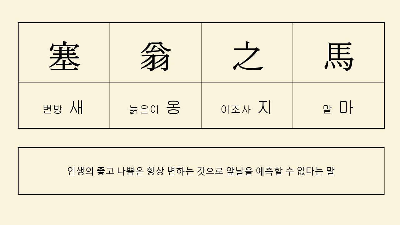 중국 전한 시대의 서책 《회남자》의 내용 중 『인간훈』에서 유래한 고사성어로 직역하면 '변방 노인의 말(馬)'이란 뜻입니다. 풀이하면 인생의 행복과 불행은 변수가 많으므로 예측이나 단정하기가 어렵다는 뜻입니다.